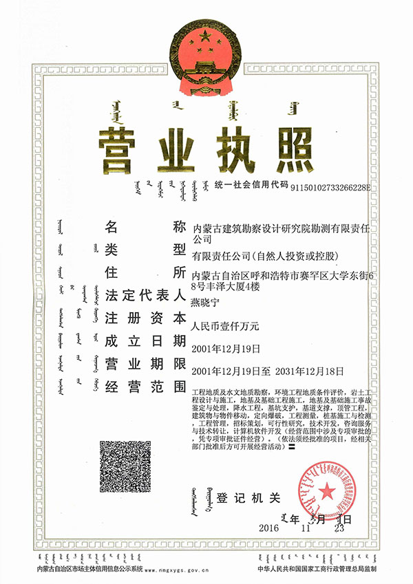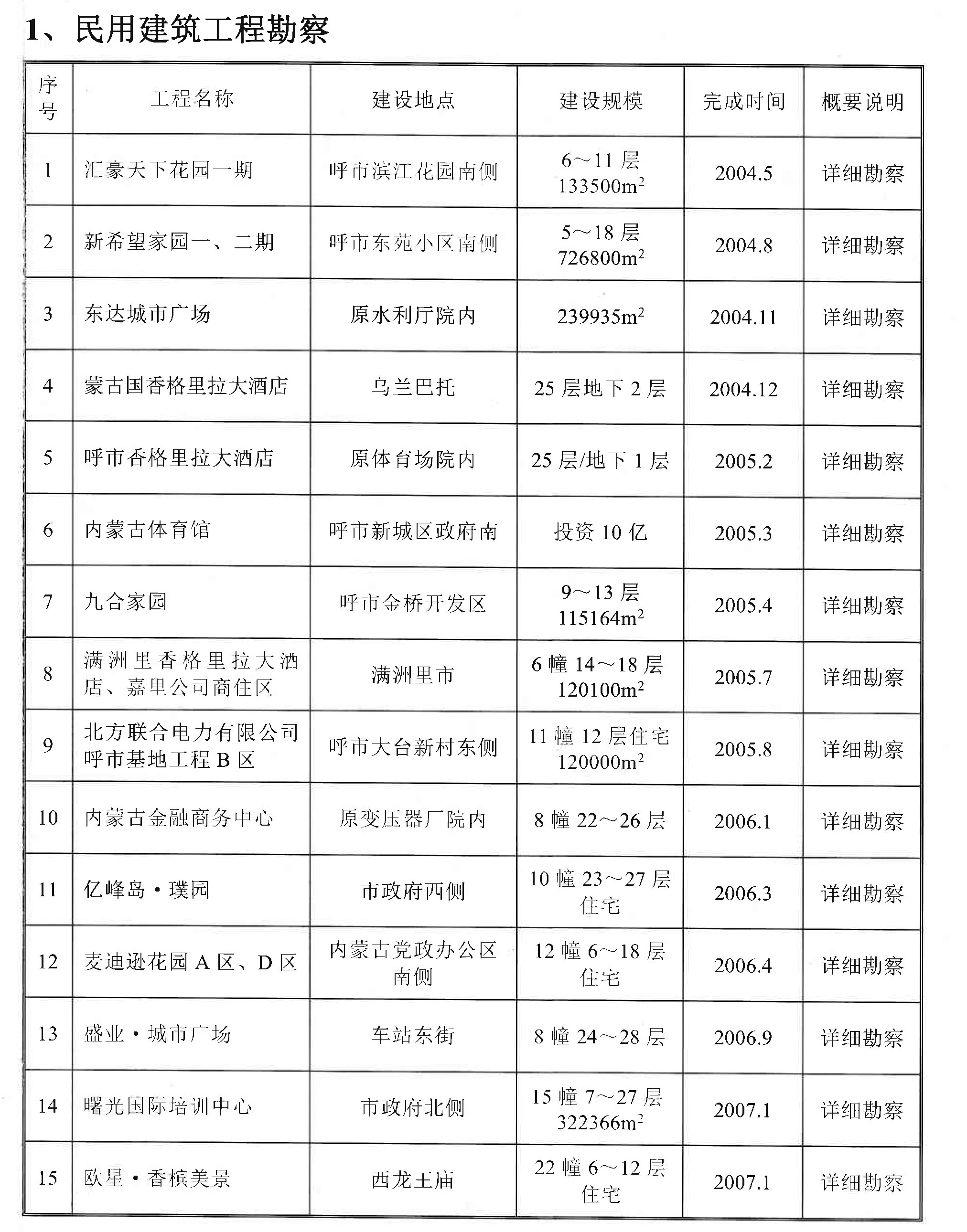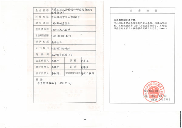 - 內(nèi)蒙古建筑勘察設(shè)計(jì)研究院勘測有限責(zé)任公司,是全國首家完成 轉(zhuǎn)企建制的省級建筑勘察設(shè)計(jì)單位。公司前身為內(nèi)蒙古建筑勘察 設(shè)計(jì)研究院勘測分院, 成立于1954年 ,經(jīng)過六十多年的發(fā)展, 現(xiàn)已成為全區(qū)技術(shù)力量雄厚、專業(yè)設(shè)置齊全的集巖土工程勘察 、 設(shè)計(jì)、治理、檢測、監(jiān)理、咨詢、水文地質(zhì)勘查、工程測量、科 研為一體的綜合性企業(yè) ... ... [查看詳情]